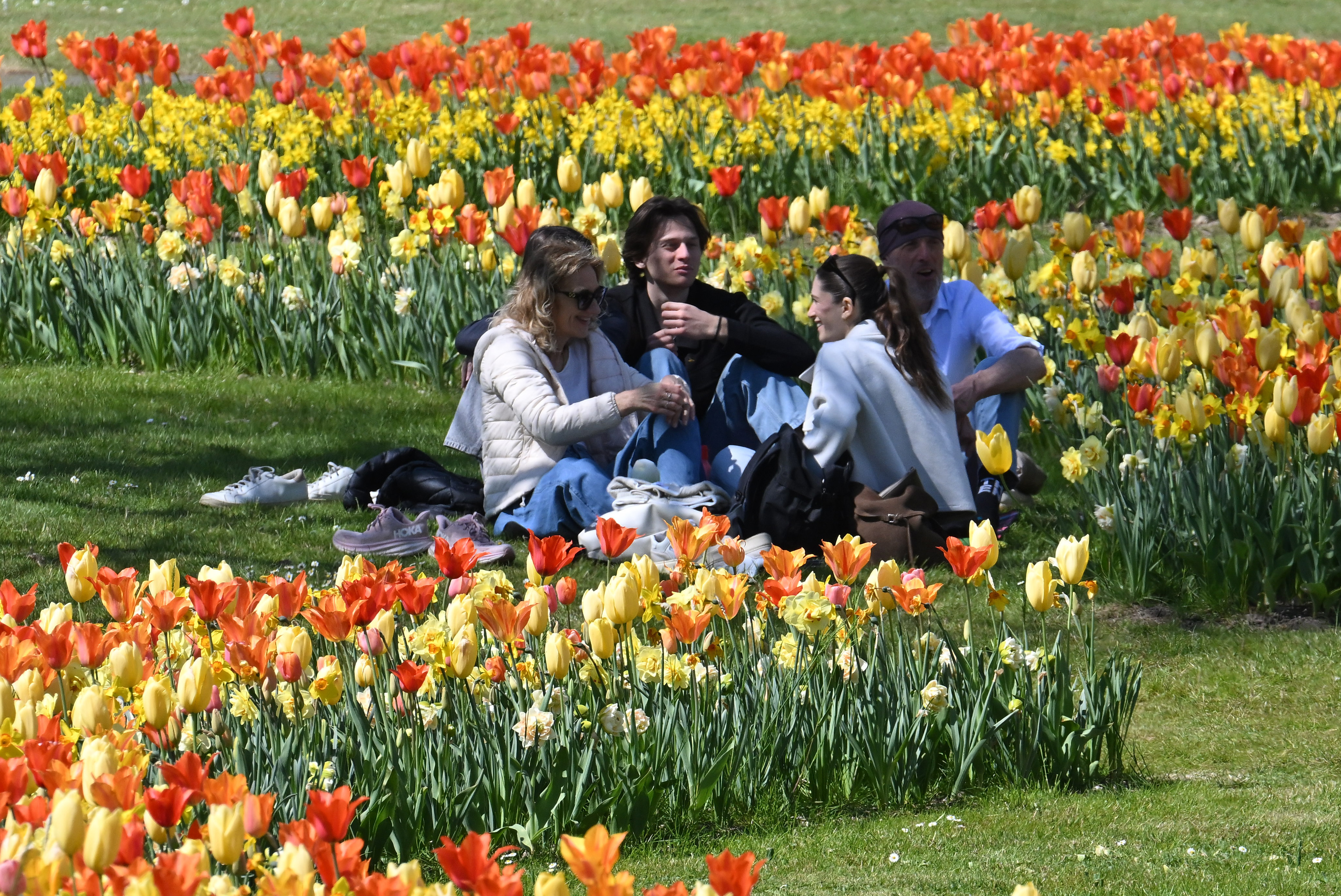 4月4日,人们在意大利维罗纳省明乔河畔瓦莱焦的西古尔塔公园赏花休闲。