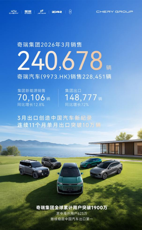 出口方面奇瑞集团 3 月单月出口为148777辆,同比增长72%刷新中国品牌单月出口历史新高。连续 11 个月单月出口突破 10 万辆,这个纪录是奇瑞创造的。3 月148777辆更是把中国品牌出海能力推向新高度,欧洲高法规市场成为新增长极。出口每 5 辆新能源汽车中就有 1 辆驶向欧洲,这说明奇瑞产品力已经得到最严苛市场认可。